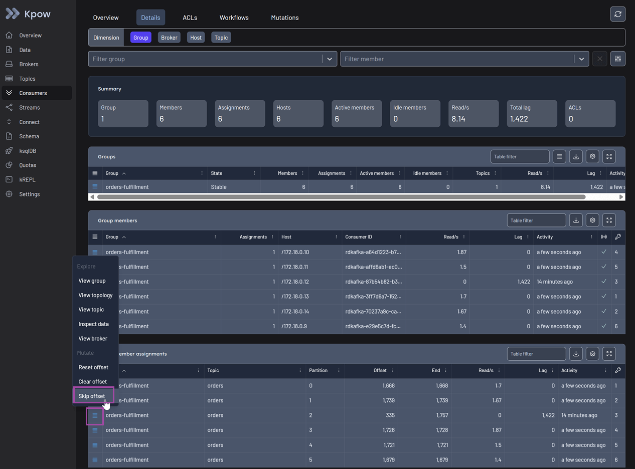 Go back to the Consumers menu. In the action menu for the stuck group member, select Skip offset.