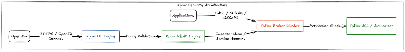 - Management tools like Kpow connect to Kafka using their own service account, not as the logged-in user. This separation is what makes RBAC enforcement possible without granting every operator direct cluster access.
