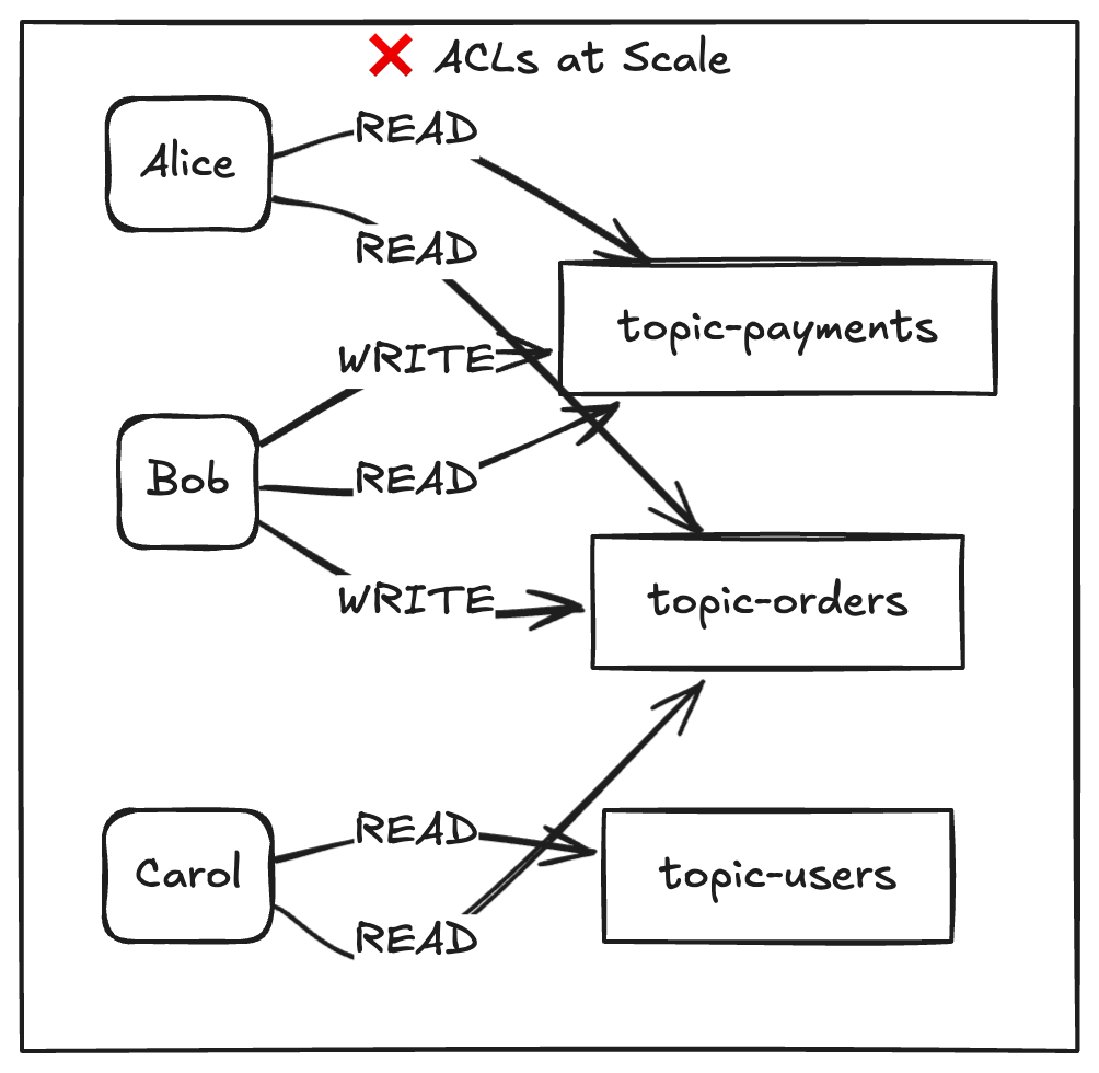 I've seen the pattern multiple times. A team starts with five topics and three services. They write a handful of ACL rules. It works. Then the platform grew to ten teams, 100+ topics, producers and consumers multiplying across environments. Suddenly there were thousands of user-to-resource rules, nobody knew who had access to what, and onboarding a new engineer meant writing rules one by one. That's when ACLs stop being a solution and become the problem.