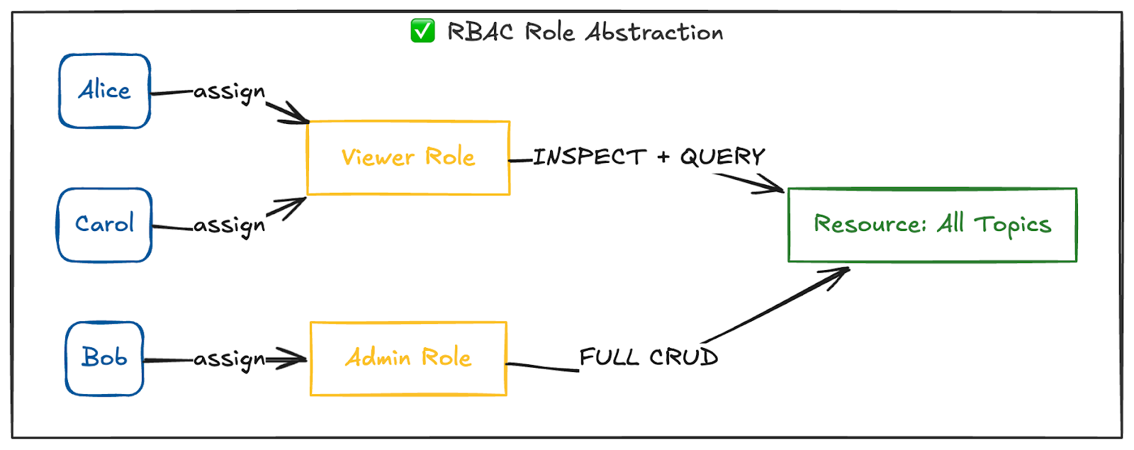 Role-Based Access Control uses a different model. Rather than assigning permissions directly between individual users and resources, it groups permissions into roles such as viewer, operator, or kafka-admin, and then assigns users to those roles. A single role change propagates to everyone assigned to it, and a single audit query shows you who can do what.