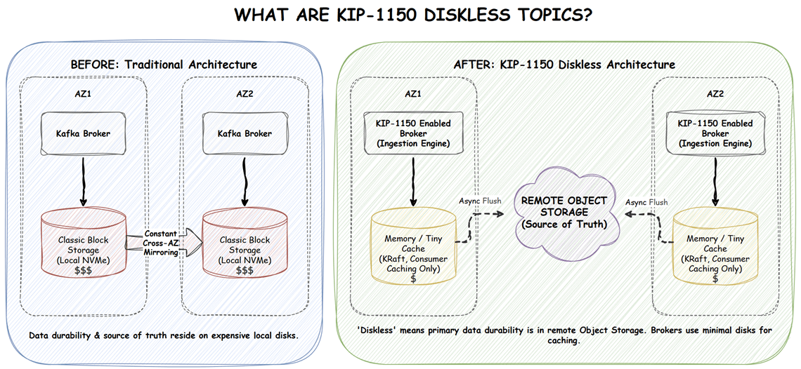 • "Diskless" is like "Serverless": It does not mean zero disks. Brokers will still use disks for KRaft metadata, caching, and batch metadata, but user data is written through to highly durable object storage.