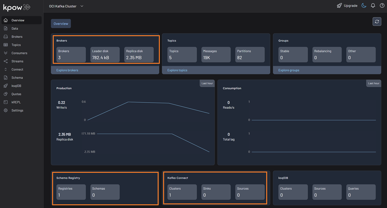 Once the container starts, navigate to http://localhost:3000. You will see an overview of your OCI topics, brokers, and consumer groups.