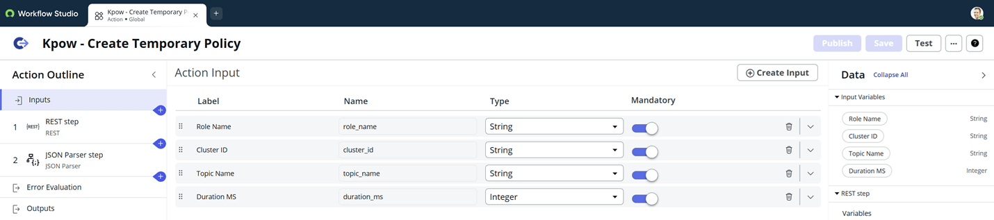 To pass the correct data to the Kpow - Create Temporary Policy action, we must create four variables. These variables act as the form fields the user fills out during the request.
