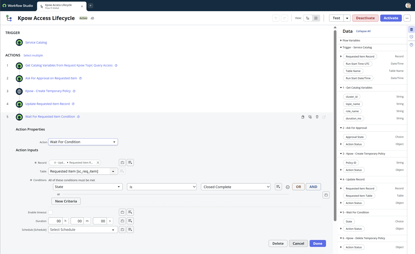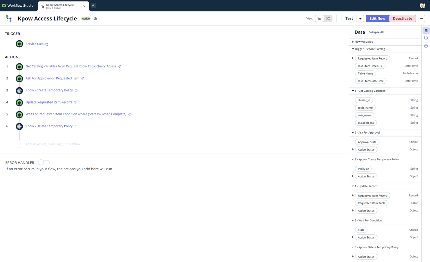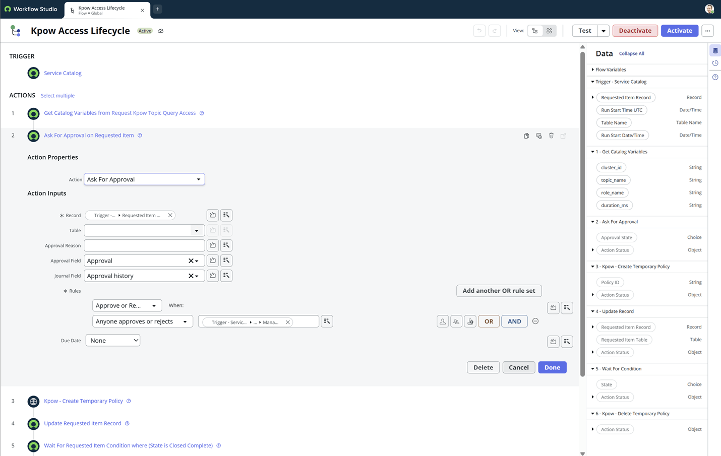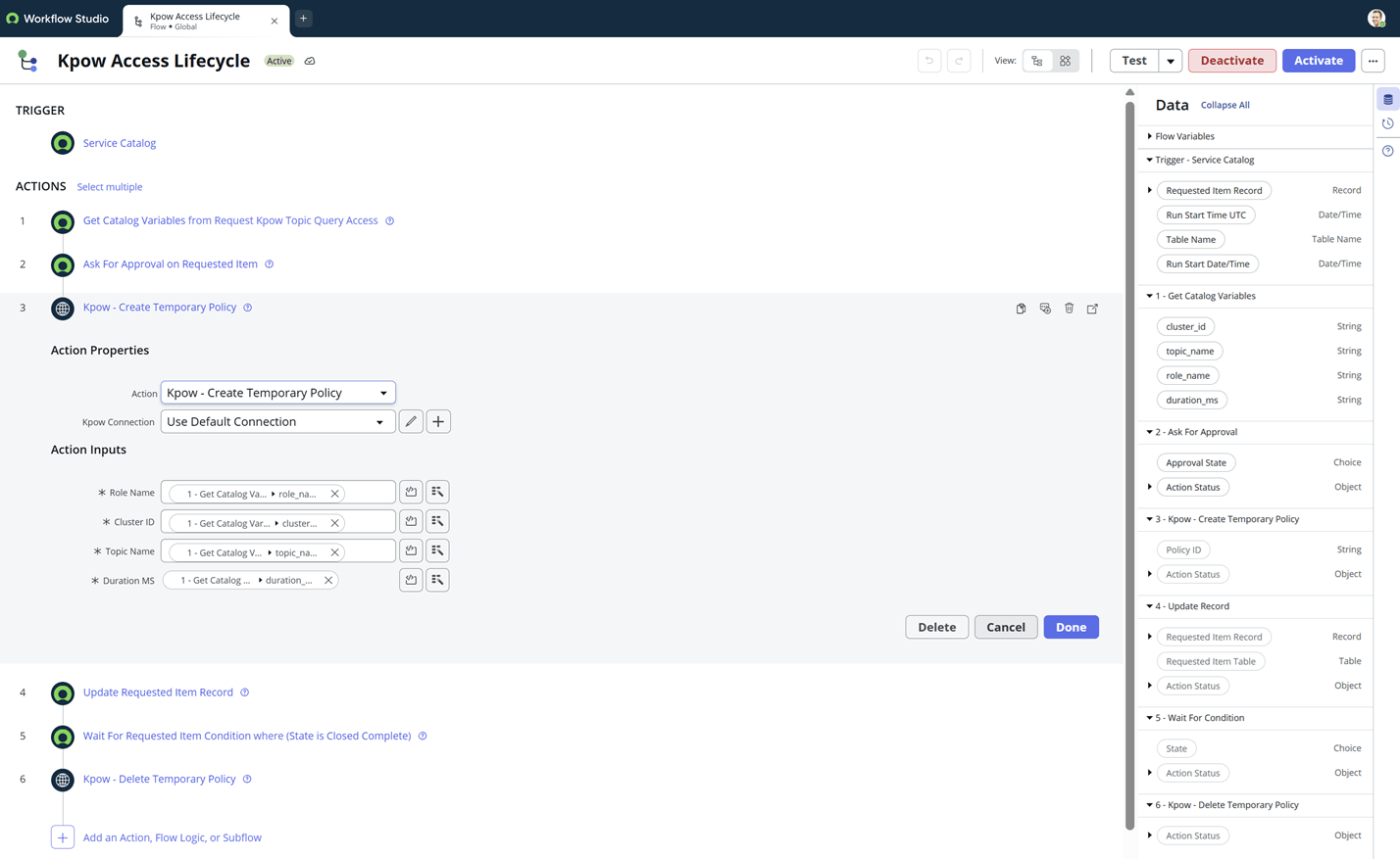 In this example, we configure a ServiceNow workflow to create and delete temporary policies using the Kpow Admin API. For full request/response schemas and additional fields, see the official documentation: