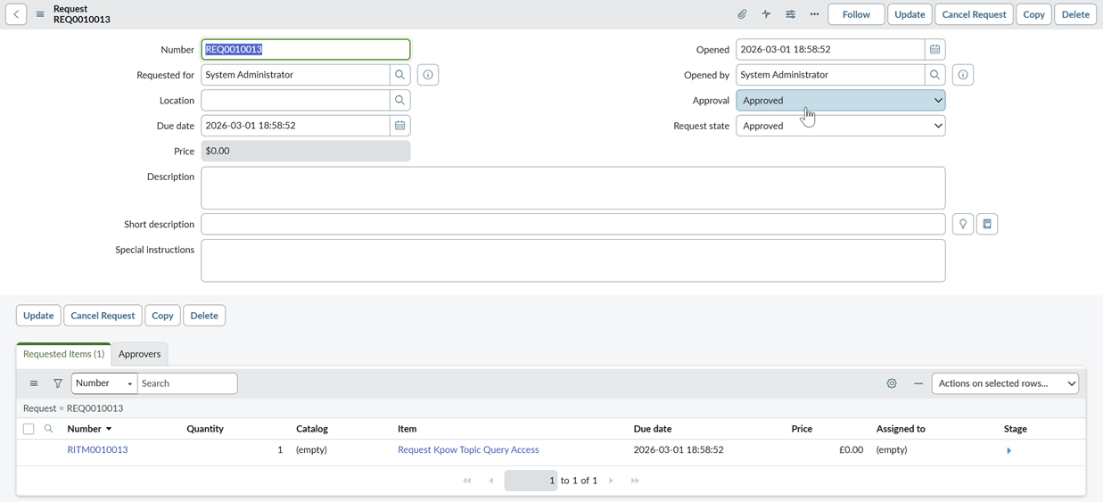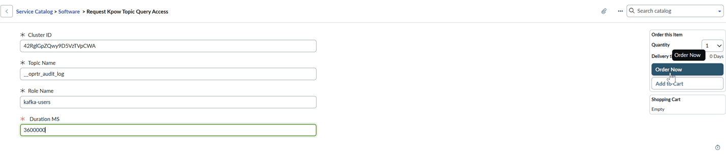 - Catalog Item: Select Request Kpow Topic Query Access.