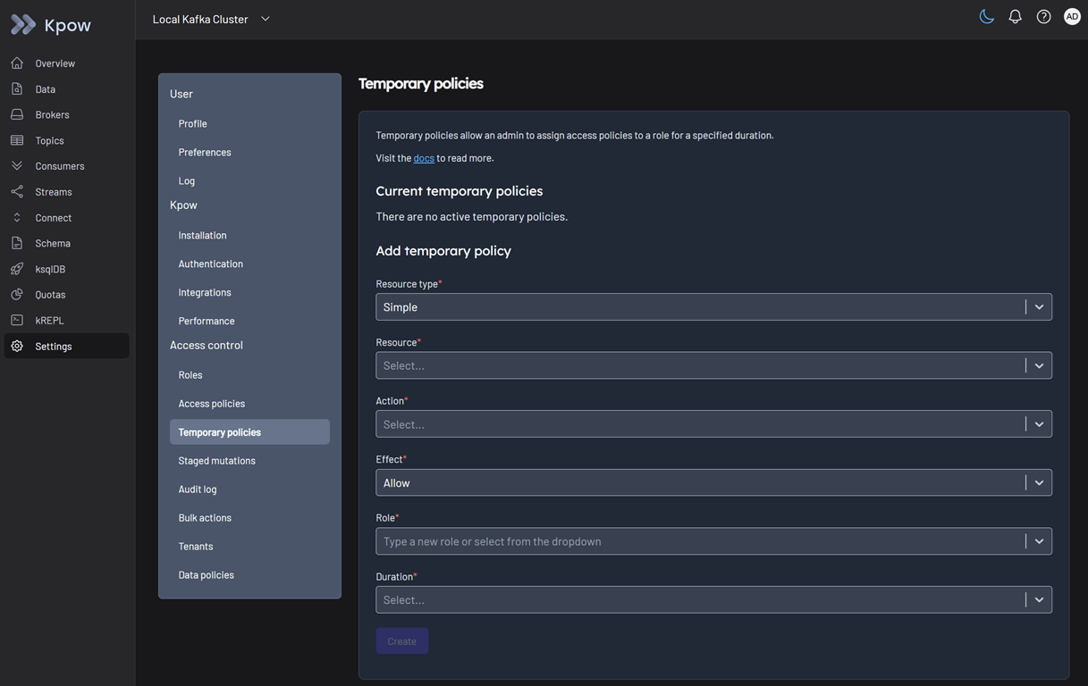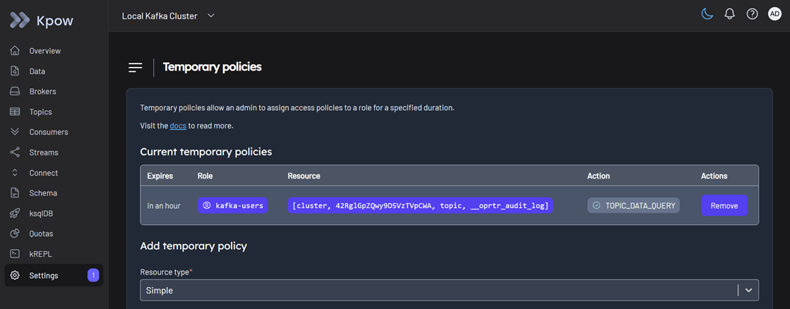 We login to Kpow as the admin user (username: admin, password: admin). In Settings > Temporary policies, we can verify that a temporary policy has been successfully created.