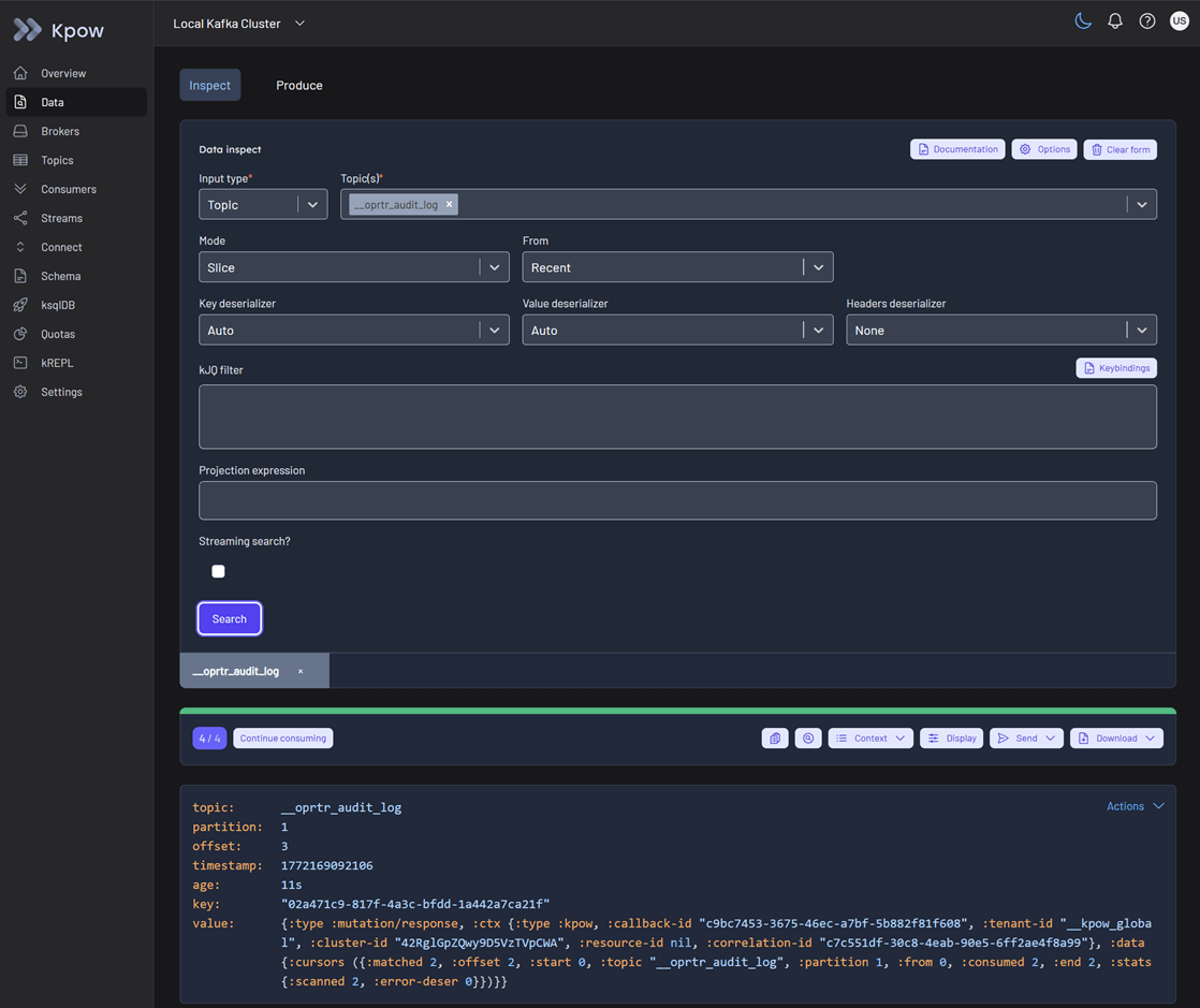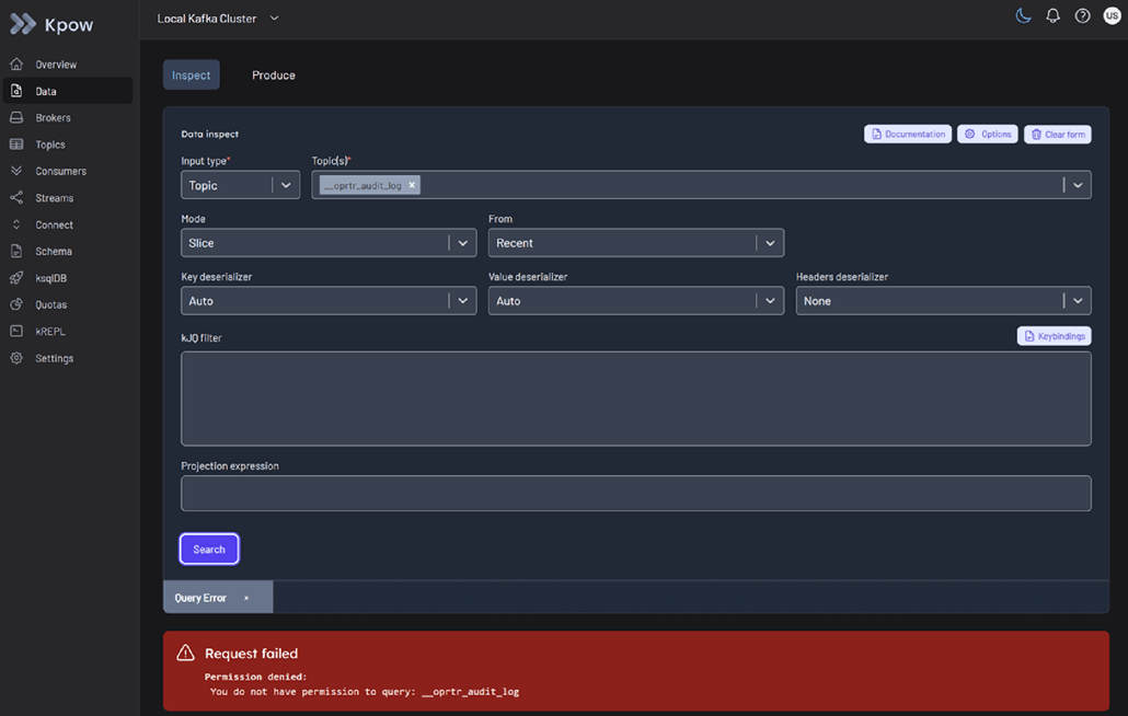 Next, we login to Kpow as the standard user (username: user, password: password). In Data > Inspect, we can now successfully search the approved topic: __oprtr_audit_log.