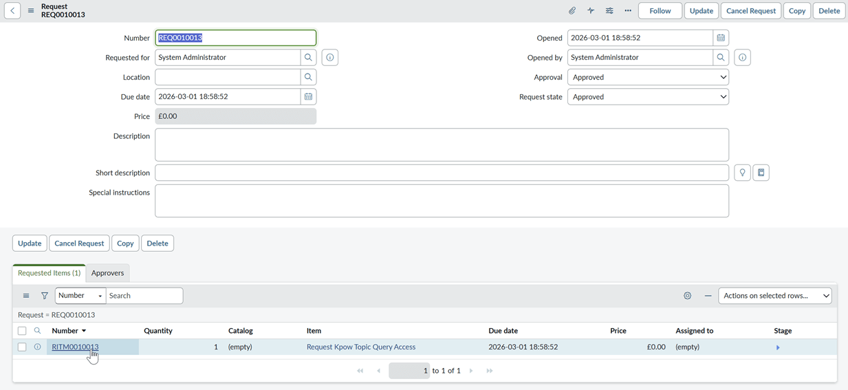To test the policy deletion and access revocation, we update the state of the requested item. First, we select the specific Requested Item (RITM).