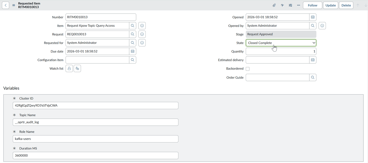 Trigger > Requested Item Record > Opened By > Manager.- Note: In a production environment, you would typically route this to Data Owners or Kafka Infrastructure Admins.