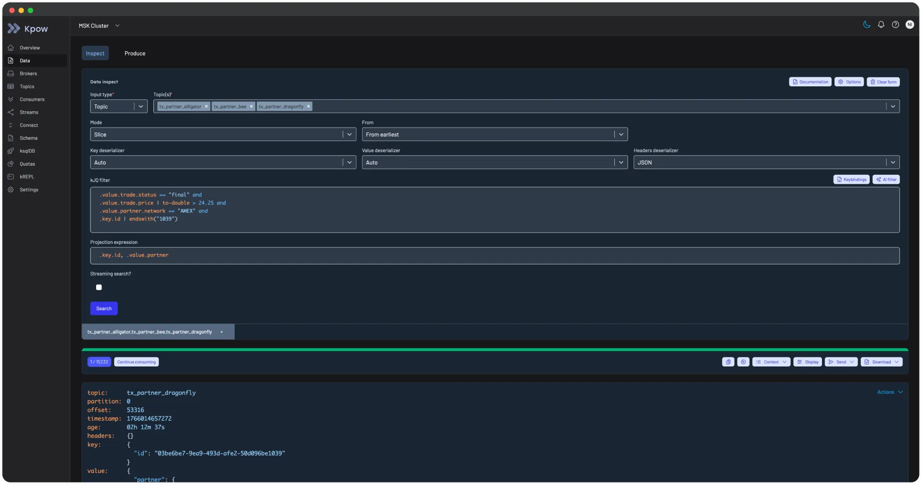 Kpow’s intuitive UI provides full visibility into your Kafka environment with a secure, vendor-agnostic OpenAPI 3.1 REST API for GitOps workflows. Experience real-time insights into your Kafka clusters, consumer groups, Streams, Connect, Schema Registry and kslqDB resources, and accelerate issue resolution with blazing fast multi-topic search with built in JQ filtering.