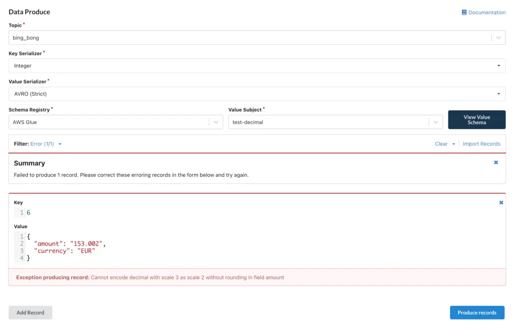 Where a schema declares a decimal logical type field our UI will check both scale and precision when producing messages. Both Avro and Avro (Strict) serdes now support consuming and producing messages with decimal fields.